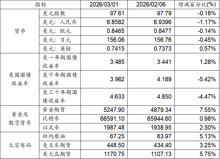 2月6日至3月1日,美元指數(shù)下跌0.18%,美元兌人民幣匯率下跌1.17%。美國一年期國債收益率上漲,而十年期及三十年期國債收益率出現(xiàn)下跌。黃金期貨價格上漲7.55%。比特幣上漲0.98%。以太幣上漲2.50%。大宗商品中紐約原油、玉米期貨及大豆期貨價格均呈現(xiàn)上升態(tài)勢。