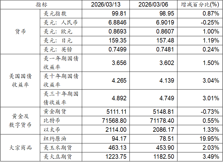 3月6日至3月13日,美元指數上漲0.87%,美元兌人民幣匯率下跌0.25%。美國一年期、十年期及三十年期國債收益率均出現上漲。黃金期貨價格下跌0.73%。比特幣上漲0.55%。以太幣上漲1.33%。大宗商品中紐約原油、玉米期貨及大豆期貨價格均呈現上升態勢。