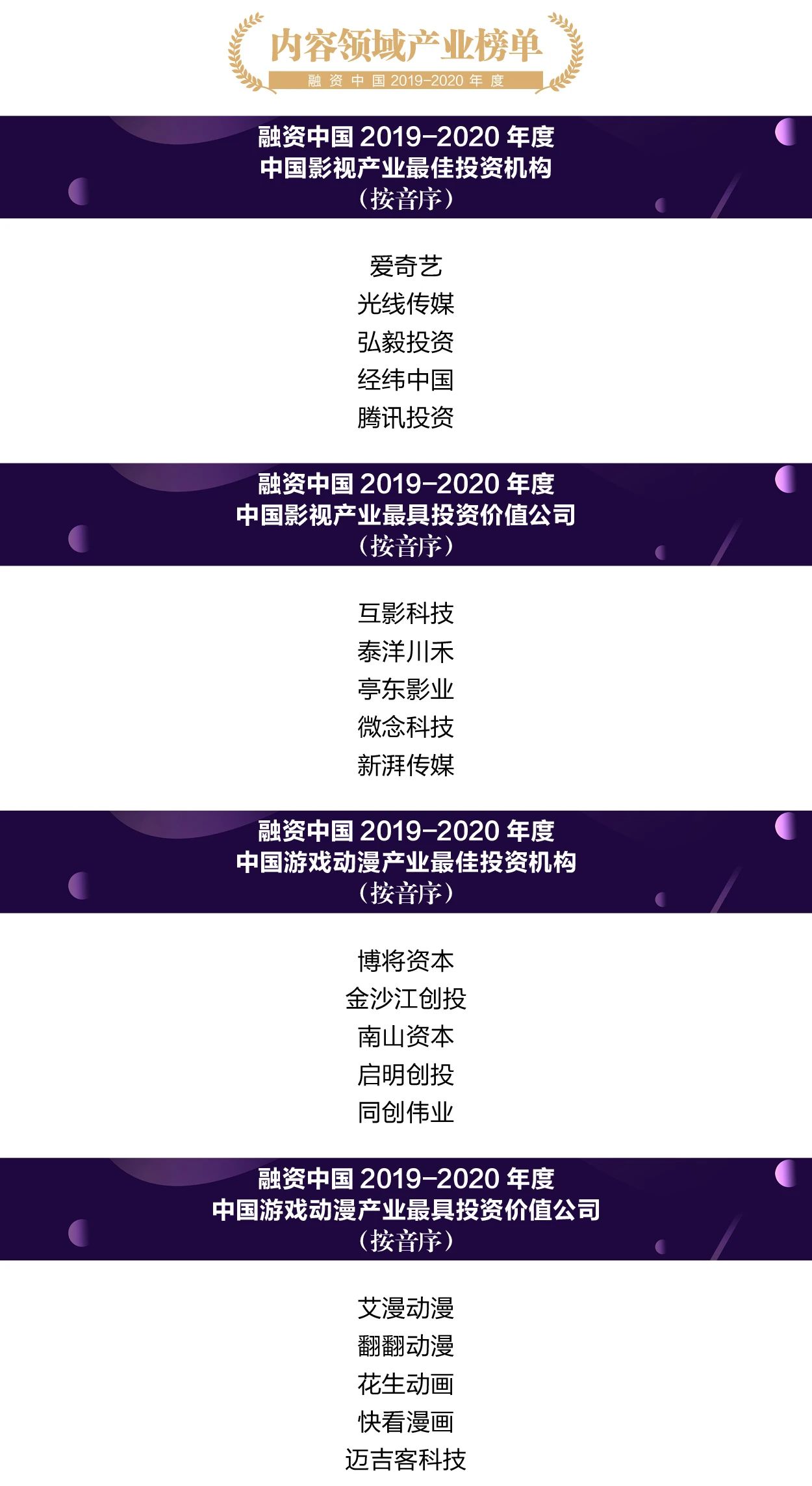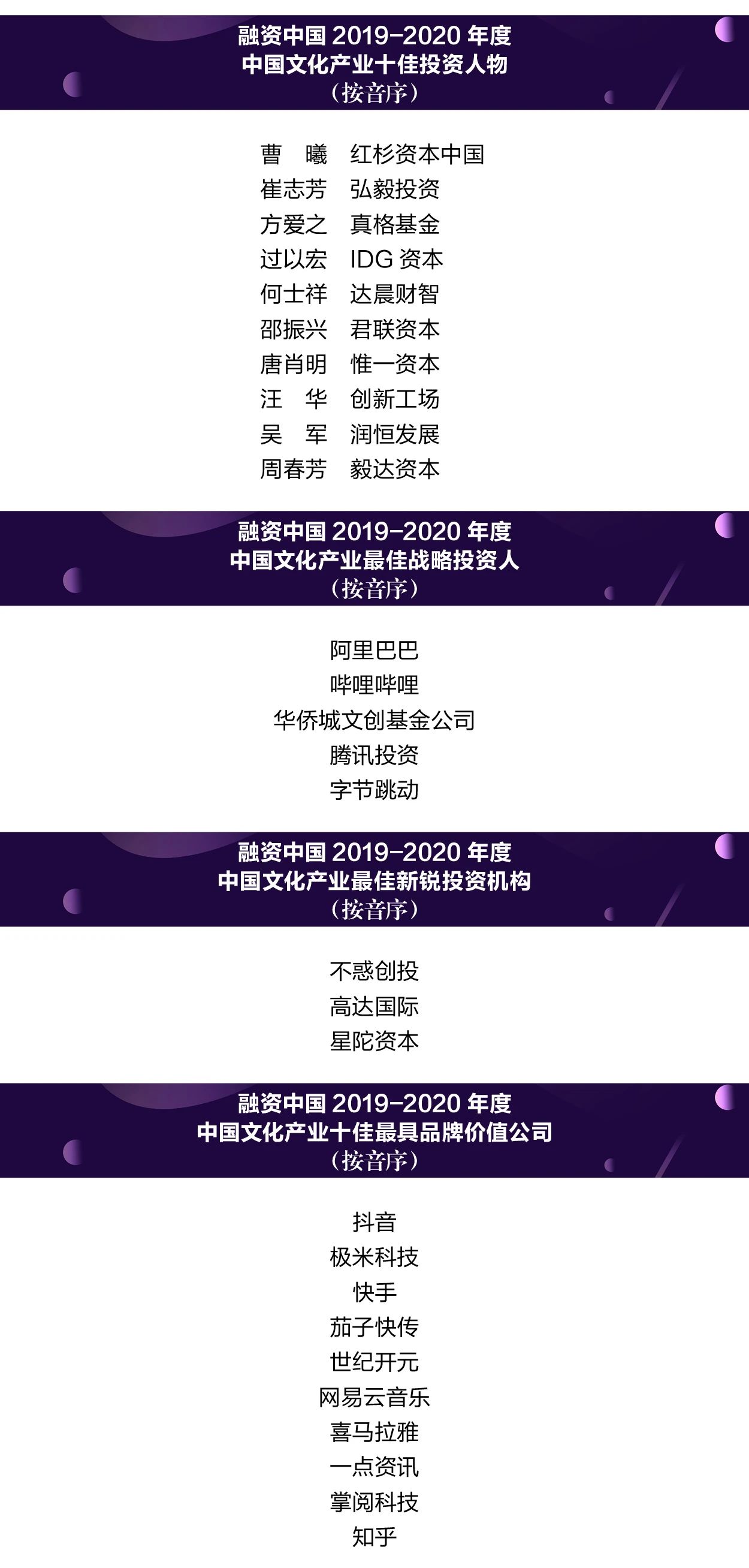 多年以來,融中研究始終以研究視野客觀選擇評判,以媒體角度公正審核結果、數據排查,力爭打造客觀、公正權威的綜合性榜單。融資中國聯合業內資深人士,通過問卷調研、數據評測等形式,隆重發布“融資中國2019-2020年度中國大文化產業榜單”。