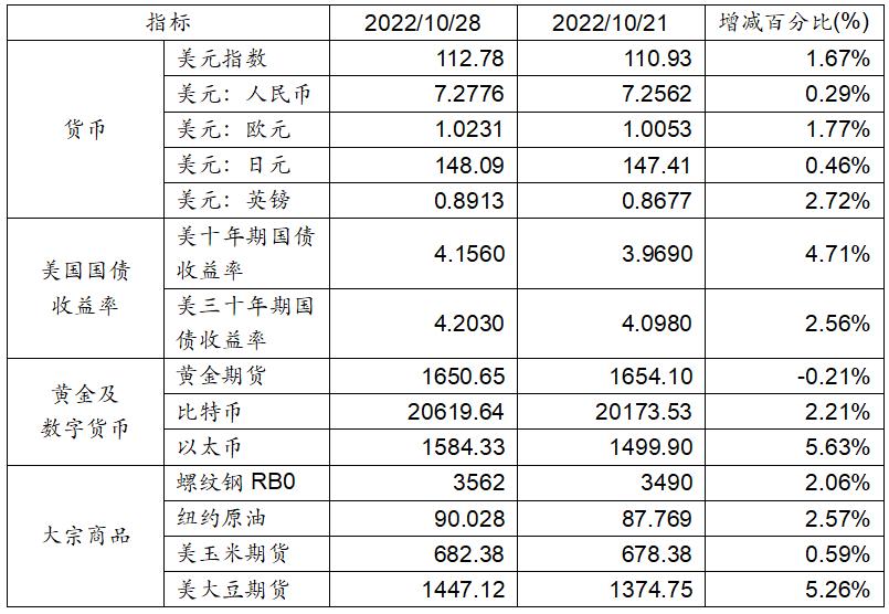 10月28日至11月04日,伴隨著美聯(lián)儲正式宣布再一次加息,美元匯率以及美國國債收益率紛紛呈現(xiàn)上漲表現(xiàn),其中美元指數(shù)上漲1.67%,美元兌人民幣匯率上漲0.19%達(dá)到1:7.2776之外,美國十年期及三十年國債收益率也分別上漲4.71%和2.56%。除黃金期貨價格略有下調(diào)之外,數(shù)字貨幣及大宗商品價格也呈現(xiàn)上漲表現(xiàn)。