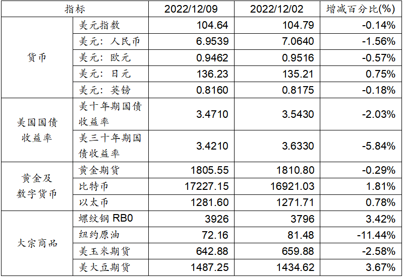 12月02日至12月09日,美元匯率表現(xiàn)依舊表現(xiàn)出來走弱態(tài)勢,美元指數(shù)下跌0.14%,美元兌人民幣匯率下跌1.56%達(dá)到1:6.9539。美國十年期及三十年國債收益率繼續(xù)下跌,分別收跌于3.4710%和3.4210%。黃金期貨價(jià)格下跌0.29%。比特幣和以太幣分別上漲1.81%和0.78%。大宗商品當(dāng)中,紐約原油價(jià)格大幅度下降11.44%,玉米期貨價(jià)格下跌2.58%,螺紋鋼和大豆期貨價(jià)格則呈現(xiàn)上漲態(tài)勢。