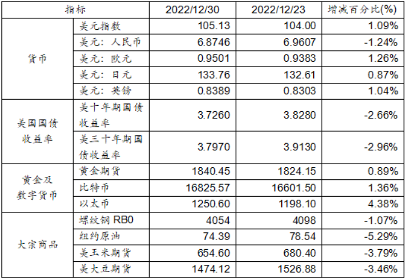 12月31日至1月6日,美元指數上漲1.09%,美元兌人民幣匯率下跌1.24%達到1:6.8746。美國十年期及三十年國債收益率呈現下跌態勢,分別收跌于3.7260%和3.7970%。黃金期貨價格上漲0.89%。比特幣上漲1.36%。以太幣上漲4.38%。大宗商品中,紐約原油、玉米期貨、大豆期貨及螺紋鋼價格均呈現下跌態勢。