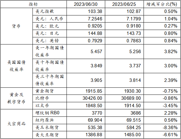 6月25日至6月30日,美元指數上漲0.50%,美元兌人民幣匯率上漲1.04%達到1:7.2546。美國一年期、十年期及三十年期國債收益率則呈現上漲態勢。黃金期貨價格下跌0.75%。比特幣下跌0.86%。以太幣下跌3.45%。大宗商品中,螺紋鋼及紐約原油價格上升,而玉米及大豆期貨價格下降。