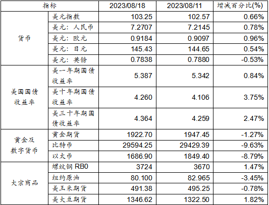 8月11日至8月18日,美元指數上漲0.16%,美元兌人民幣匯率上漲0.78%達到1:7.2707。美國一年期、十年期以及三十年其國債收益率均出現上漲。黃金期貨價格下跌1.27%。比特幣下跌9.63%。以太幣下跌8.79%。大宗商品中,螺紋鋼及大豆期貨價格出現上漲,,而紐約原油及玉米期貨價格則呈現下跌。