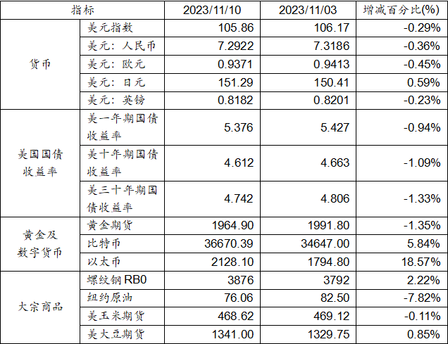 11月3日至11月10日,美元指數下跌0.29%,美元兌人民幣匯率下跌0.36%達到1:7.2922。美國一年期、十年及三十年國債收益率均下跌。黃金期貨價格下跌1.35%。比特幣上漲5.84%。以太幣大漲18.57%。大宗商品中,螺紋鋼、大豆期貨價格上漲,而玉米期貨、紐約原油價格均出現下跌。