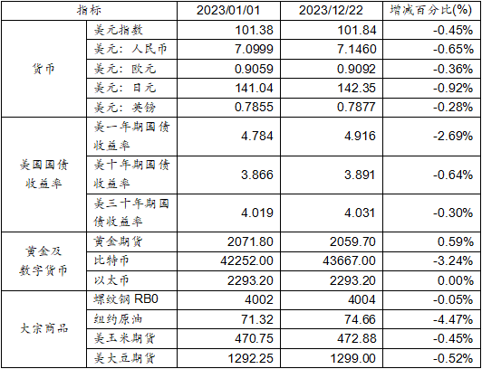 12月22日至1月1日,美元指數下跌0.45%,美元兌人民幣匯率下跌0.65%達到1:7.0999。美國一年期、十年期及三十年期國債收益率均下跌。黃金期貨價格上漲0.59%。比特幣下跌3.24%。以太幣基本不變。大宗商品中,螺紋鋼、紐約原油、玉米期貨及大豆期貨價格均呈現下跌。