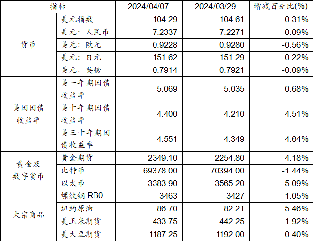 3月29日至4月7日,美元指數下跌0.31%,美元兌人民幣匯率上漲0.09%達到1:7.2337。美國一年期、十年期及三十年期國債收率上漲。黃金期貨價格上漲4.18%。比特幣下跌1.44%。以太幣下跌5.09%。大宗商品中,螺紋鋼及紐約原油價格上漲,而玉米期貨及大豆期貨價格呈現下跌態勢。