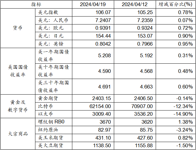 4月12日至4月19日,美元指數上漲0.78%,美元兌人民幣匯率上漲0.07%達到1:7.2407。美國一年期、十年期及三十年期國債收益率均上漲。黃金期貨價格下跌0.14%。比特幣下跌12.34%。以太幣下跌14.90%。大宗商品中,螺紋鋼、玉米期貨價格上漲,而紐約原油及大豆期貨價格則呈現下跌態勢。