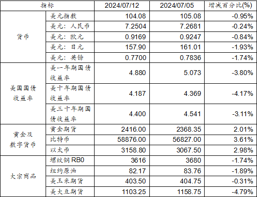 7月5日至7月12日,美元指數下跌0.95%,美元兌人民幣匯率下跌0.24%至1:7.2504。美國一年期、十年期及三十年期國債收益率均呈現下跌。黃金期貨價格上漲2.01%。比特幣上漲3.71%。以太幣上漲2.98%。大宗商品中,紐約原油、螺紋鋼、大豆期貨及玉米期貨價格均呈現下跌態(tài)勢。