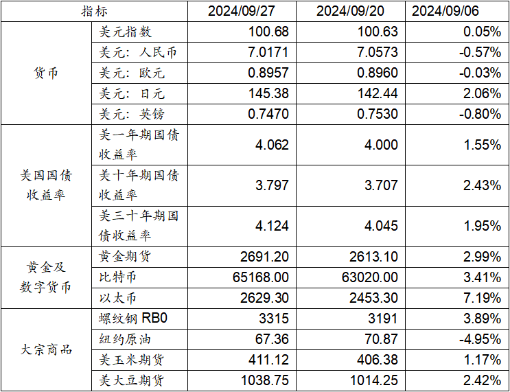 9月20日至9月27日,美元指數上漲0.05%,美元兌人民幣匯率下跌0.57%至1:7.0171。美國一年期國債、十年期及三十年期國債收益率均呈現上漲態勢。黃金期貨價格上漲2.99%。比特幣上漲3.41%。以太幣上漲7.19%。大宗商品中紐約原油價格下跌,而螺紋鋼、玉米期貨及大豆期貨價格則呈現上漲態勢。