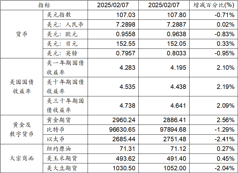 2月7日至2月14日,美元指數(shù)下跌0.71%,美元兌人民幣匯率上漲0.02%。美國(guó)一年期、十年期及三十年其國(guó)債收益率均上升。黃金期貨價(jià)格上漲2.56%。比特幣下跌1.29%。以太幣下跌2.41%。大宗商品中紐約原油及玉米期貨價(jià)格上漲,而大豆期貨的價(jià)格則呈現(xiàn)下跌態(tài)勢(shì)。