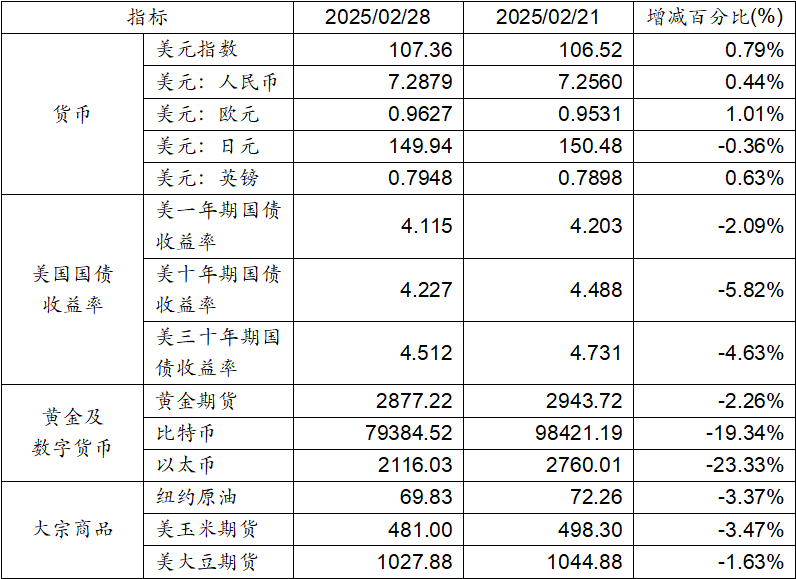 2月21日至2月28日,美元指數上漲0.79%,美元兌人民幣匯率上漲0.44%。美國一年期、十年期及三十年期國債收益率均下跌。黃金期貨價格下跌2.26%。比特幣大跌19.34%。以太幣大跌23.33%。大宗商品中紐約原油、玉米期貨及大豆期貨價格均呈現下跌態勢。