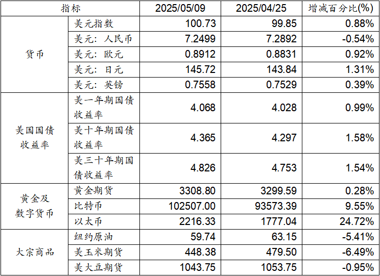 4月25日至5月9日,美元指數(shù)上漲0.88%,美元兌人民幣匯率下跌0.54%。美國一年期十年期及三十年期國債收益率均呈現(xiàn)上漲態(tài)勢。黃金期貨價格上漲0.28%。比特幣大漲9.55%。以太幣大漲24.72%。大宗商品中紐約原油、玉米期貨及大豆期貨價格均呈現(xiàn)下跌。