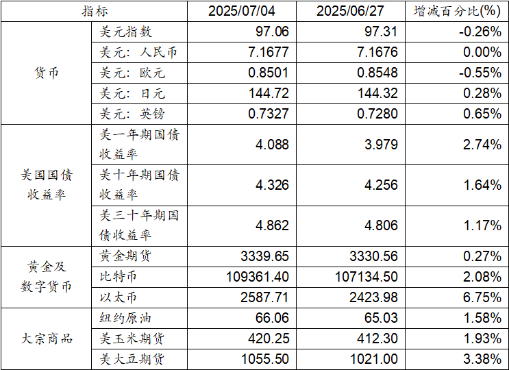 6月27日至7月4日,美元指數下跌0.26%,美元兌人民幣匯率基本不變。美國一年期十年期及三十年期國債收益率均呈現上漲態勢。黃金期貨價格上漲0.27%。比特幣上漲2.08%。以太幣上漲6.75%。大宗商品中紐約原油、玉米期貨及大豆期貨價格均呈現上漲態勢。