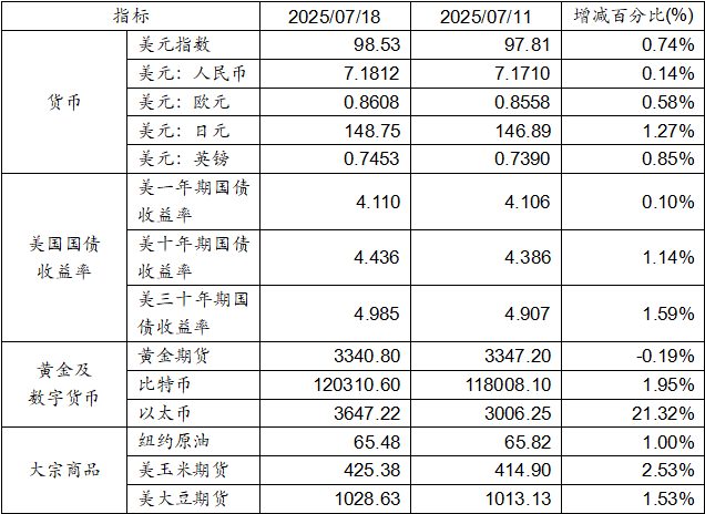 7月11日至7月18日,美元指數(shù)上漲0.74%,美元兌人民幣匯率上漲0.14%。美國(guó)一年期十年期及三十年期國(guó)債收益率均呈現(xiàn)上漲態(tài)勢(shì)。黃金期貨價(jià)格下跌0.19%。比特幣上漲1.95%。以太幣上漲21.32%。大宗商品中紐約原油、玉米期貨及大豆期貨價(jià)格均呈現(xiàn)上漲態(tài)勢(shì)。