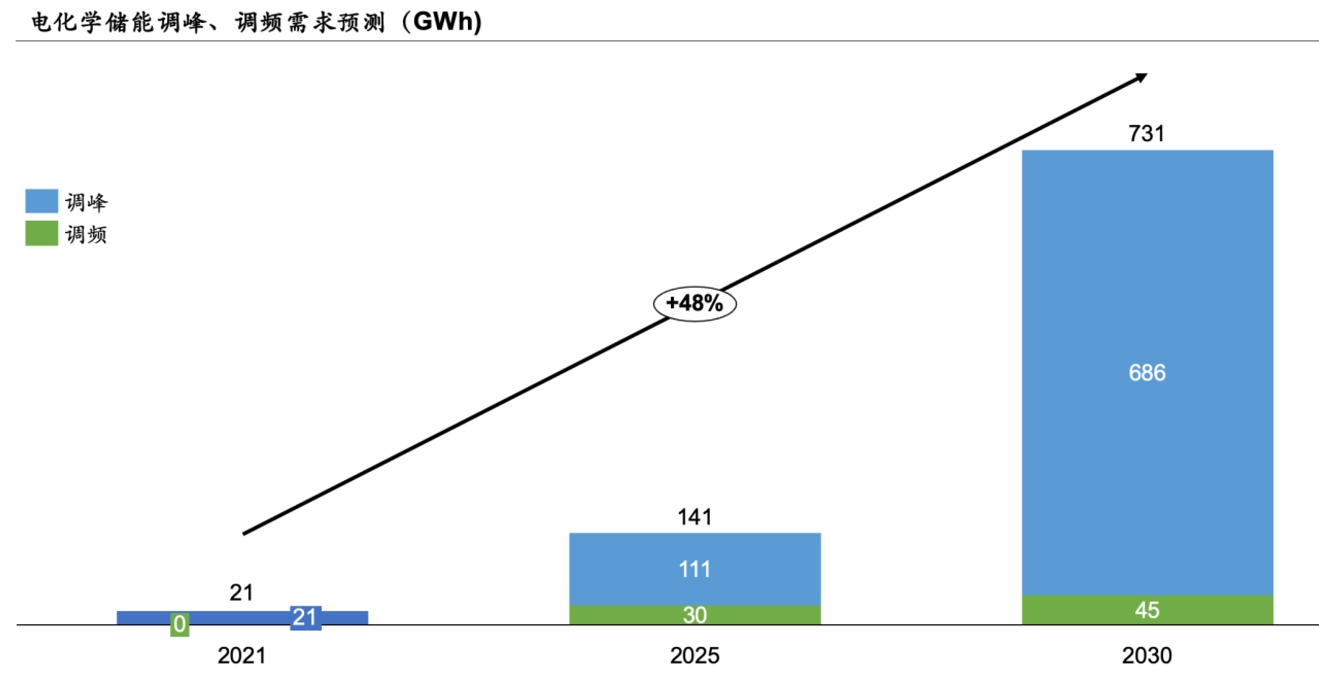 到2025年和2030年,我國電化學儲能的調(diào)峰、調(diào)頻缺口將分別達到141GWh和731GWh,相比于2021年數(shù)據(jù),CAGR可達48%。
