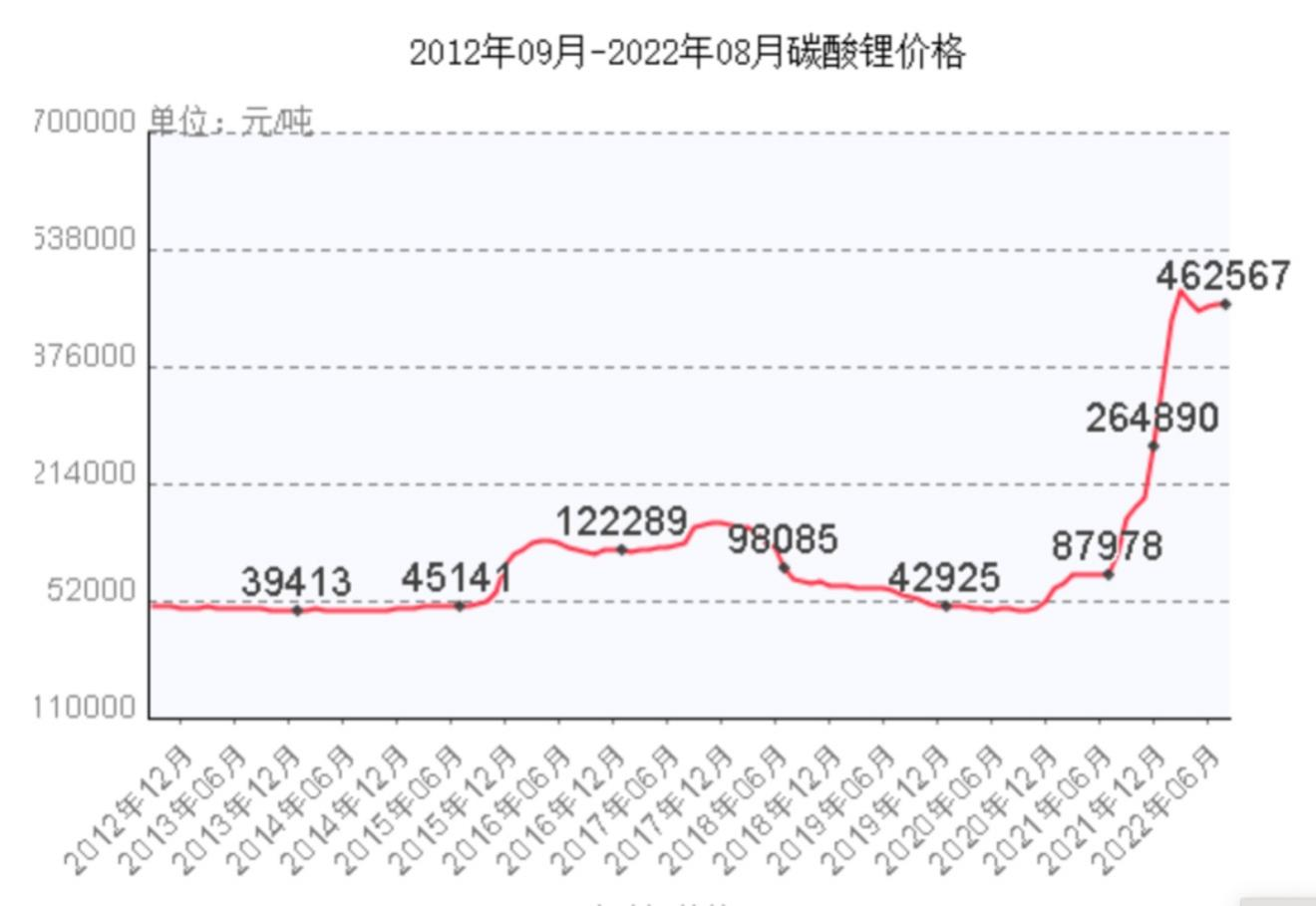 磷酸鐵鋰電池不光在儲能中是主流路線,在新能源車中也是。在近幾年新能源車和儲能的強勢合攻下,上游碳酸鋰價格已經(jīng)從2020年的4.3萬元/噸上漲到了如今的46萬元/噸,并維持在高位。