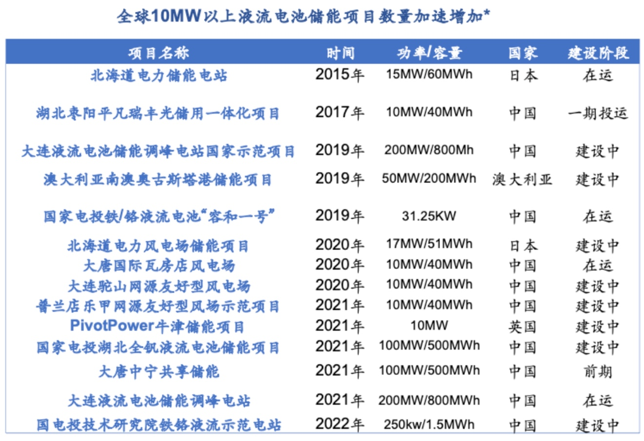 可以看到,2020年之后10MW以上的液流電池儲能項目出現(xiàn)井噴式增長。尤其是國家能源局批準建設(shè)的首個國家級大型化學儲能示范項目——大連液流電池儲能調(diào)峰電站(全釩) 的建設(shè)規(guī)模達到了200MW,總投資38億元。第一期工程已建設(shè)完成,于今年5月正式接入遼寧電網(wǎng),正式進入商業(yè)化運行階段。