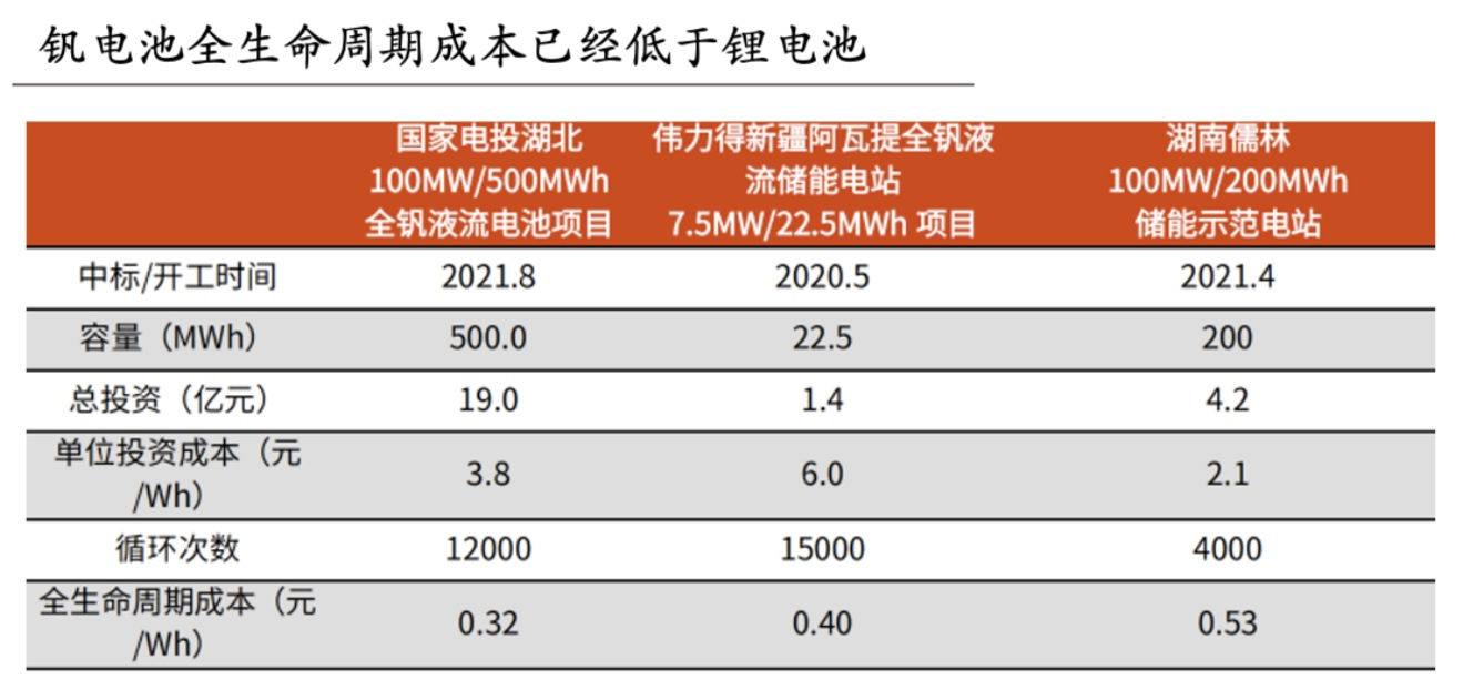 但是從全生命周期角度看,全釩的成本約0.32-0.4元/Wh,成本依然低于鋰電池(鋰電池成本0.5-0.7元/Wh)。