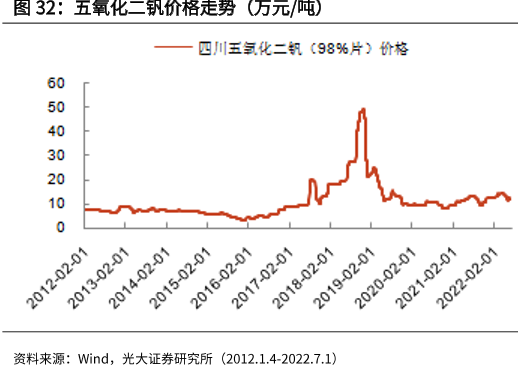 從五氧化二釩的歷史價格走勢來看,價格長期維持在10.8萬元/噸附近(僅在2017-2018年出現(xiàn)了大幅上漲的情形,主要是環(huán)保嚴查、進口釩渣被禁止以及鋼筋指標變化釩需求增加多重利好因素疊加導(dǎo)致)。